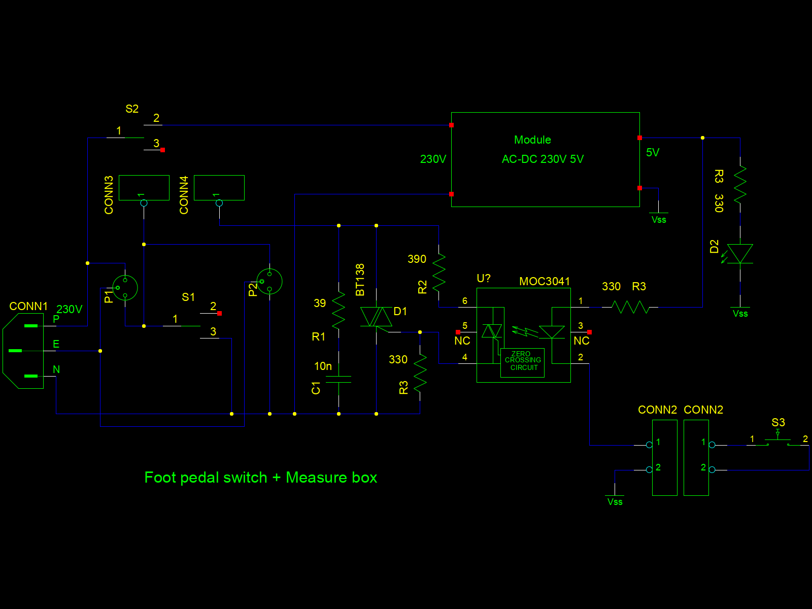 Le contact de mise en marche est effectué par un triac commandé par un optocoupleur et un contact sec alimenté en 5 V, car on évite d'envoyer du 230 V sur des circuits non protégé. L'appui sur la pédale ferme le contact et active le triac.