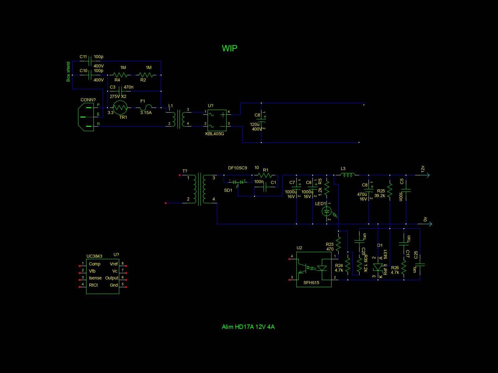 Il ne reste plus qu'à trouver le composant défectueux et mes doutes se portent sur le condensateur de filtrage au primaire. Je le démonte et mesure sa valeur qui est de quelques picofarads au lieu des 120 micro marqué sur le boitier. Je remplace le condensateur par un trouvé sur une alimenation de TV. Il est un peu plus gros et ne rentre pas dans le boitier, mais il servira juste à faire un essai concluant. Il est en cours d'approvisionnement...