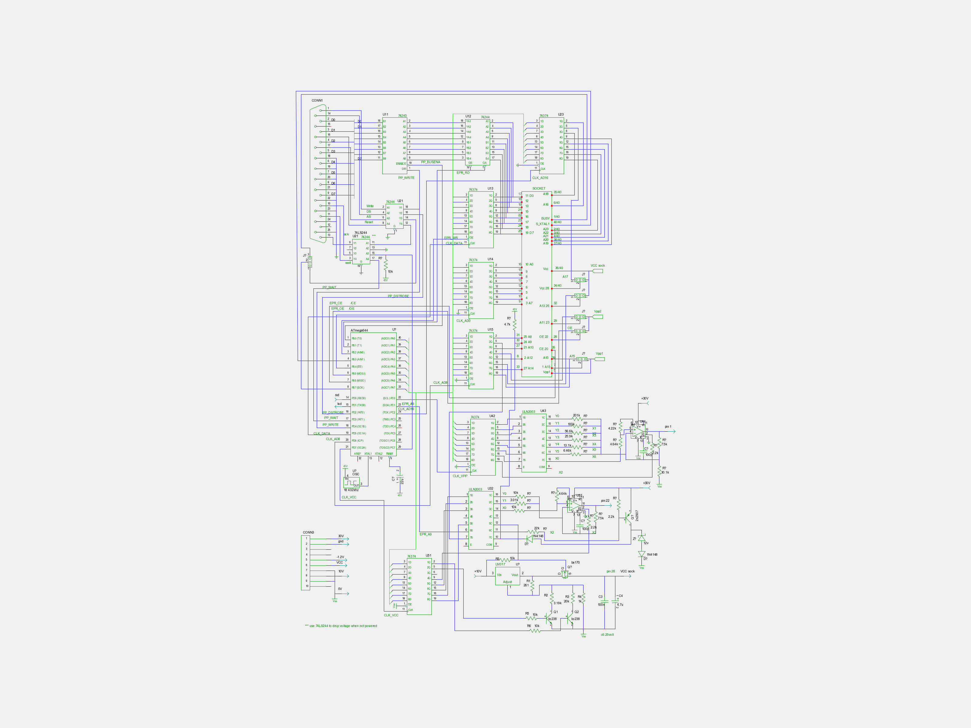 Hardware, essentialy, consists of port extension around the micro and two programming voltage generators, just in order to symplify the wiring for some old devices. The first one is programmable from 9.5 Volts to 25.5 Volts in step of 0.25 Volt and has to supply 0, 5 Volts as well (The luxe !). The second is limited to 0, 5, 12.5 and 25 Volts. A control of the power supply voltage for the device is also implemented for 0, 5, 6, 6.25 volts. Note some manual switching are necessary before accessing these old devices like 2716 (Not the luxe !).