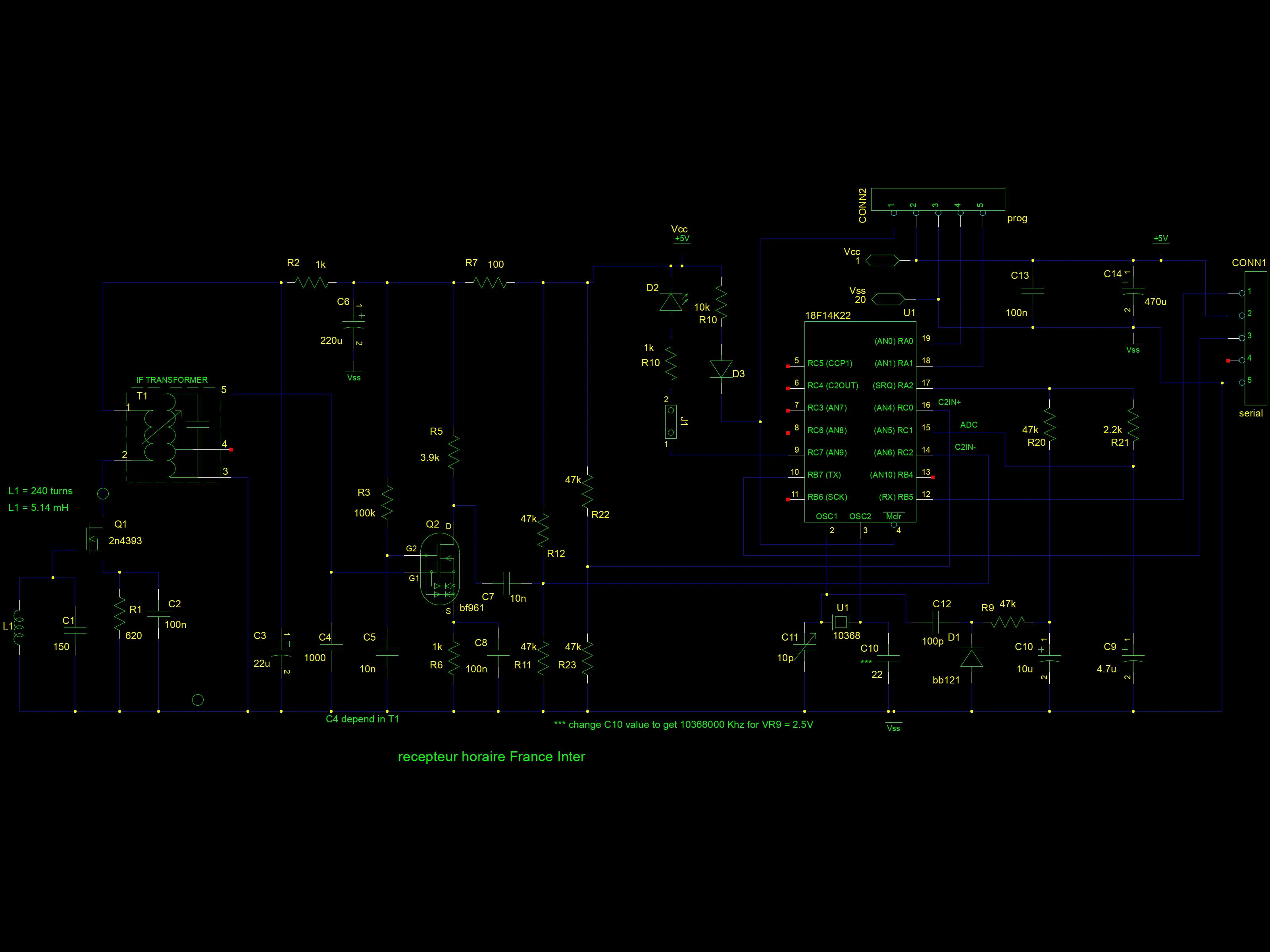 Vous trouverez ici, une nouvelle réalisation d'un récepteur de signaux horaires émis sur Allouis GO à 162 Khz (ex France Inter). Le principe de fonctionnement est identique à celui décrit sur cette page. Cependant le montage s'appuie sur une caratéristique du microprocesseur PIC 18f14k22. En effet ce circuit contient un SR Latch, c'est à dire une bascule Set et Reset, qui, utilisé en comparateur de phase, permet de remplacer le circuit CD4046 du montage précédent, rendant ainsi le montage plus compact.